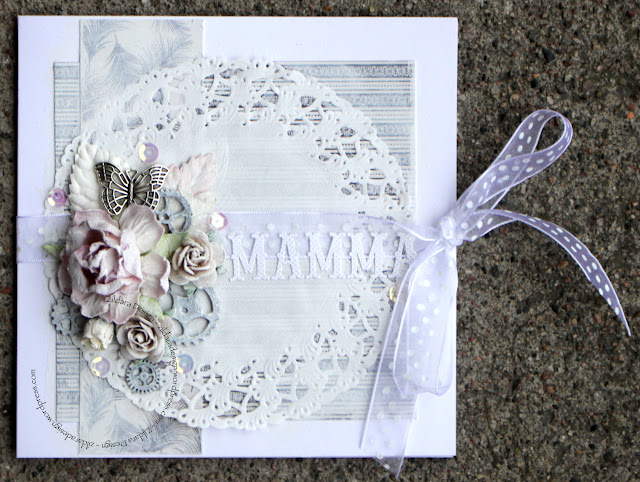 Mors dag 2018. På beställning gjorde jag ett kort i vitt och ljusvitt, med många lager och ett knytband. Jag tycker verkligen om känslan i kortet, det skira och liksom bräckliga. Det här kortet ska jag lifta i år.
